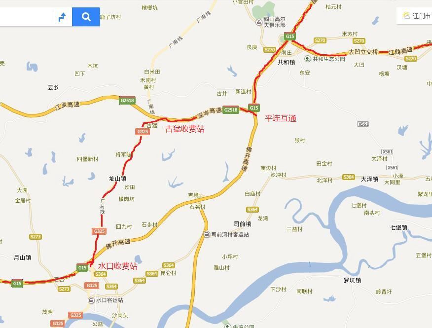 近端分流绕行建议:从沙湖收费站下高速后,绕行325国道通过开平后,从古猛收费站上江罗高速,再转沈海高速通行。