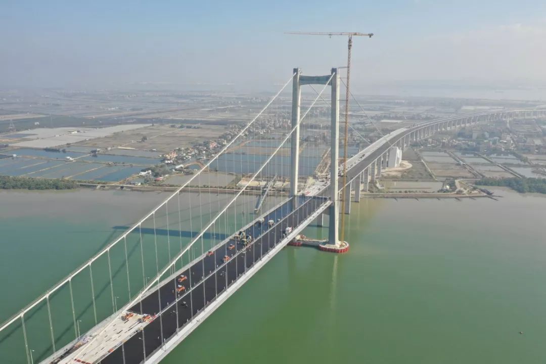 路面铺装方面,主桥钢桥面铺装已完成,引桥路面进入规模化作业阶段,春节期间完成东涌互通-大沙水道桥的引桥部分铺装,机电交安等附属工程也正有序推进。