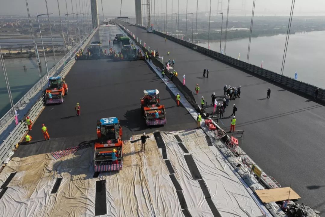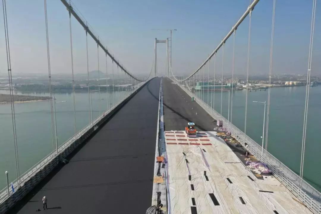 历经100多天的紧张施工,虎门二桥项目两座超千米级主桥钢桥面环氧沥青铺装工程圆满完成啦!