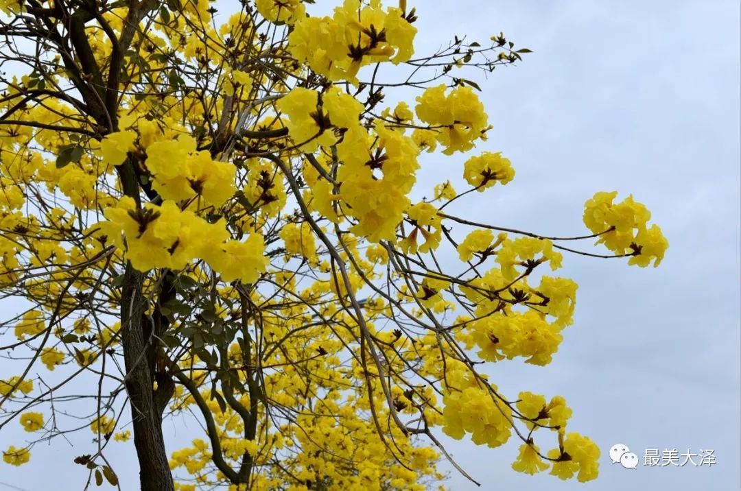 在大泽新城润泽南路的道路两旁,生态公园里的山坡、路边,新开公路旁牛勒处的花木场等地,都是欣赏黄花风铃绝佳之地。