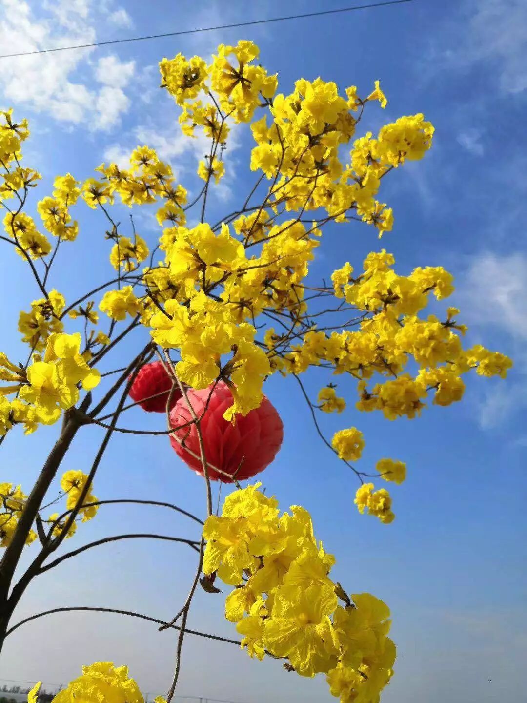 三四米高的黄花风铃木,金灿灿花儿已按捺不住争相盛开,团团黄花锦簇,恰似串串风铃。