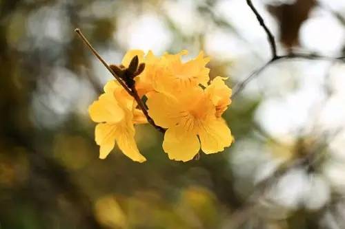 黄花风铃木,金黄色的花朵,迎风摇曳好似风铃般可爱,伴随着微风,仿佛听到清脆的铃声。
