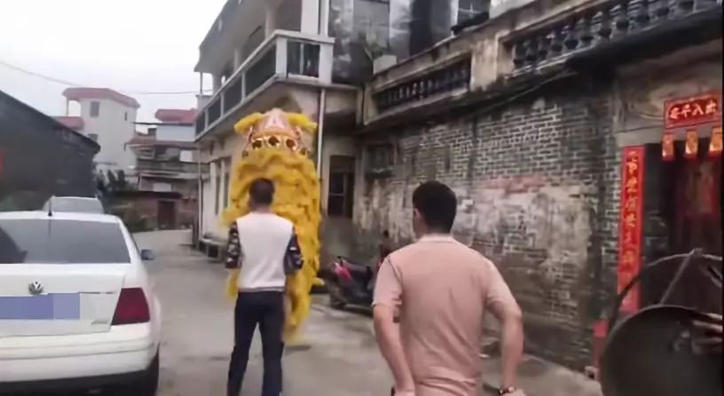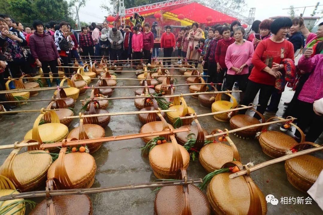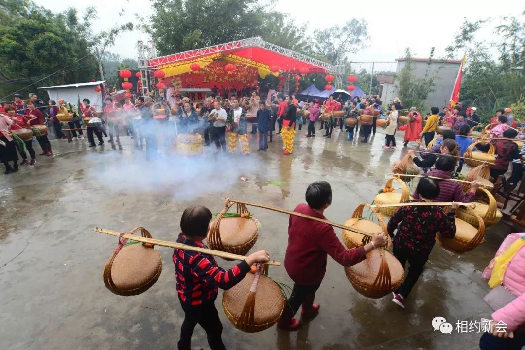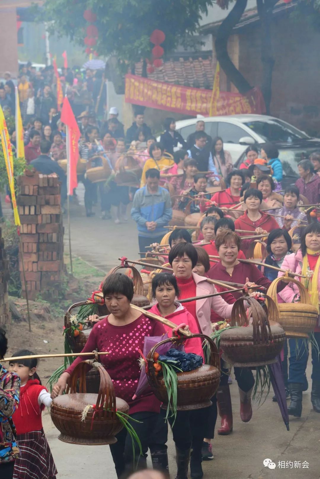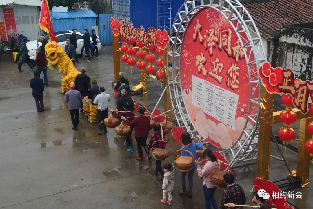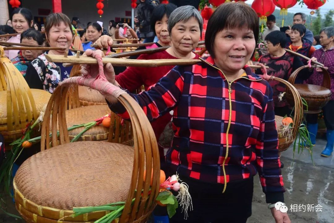 随着阵阵鞭炮声、锣鼓声,醒狮起舞,聚集在一起的村妇们挑起蓝子,依次排好队伍,在大空地上连续转几个大圈子。