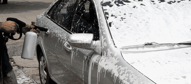 拿着高压水枪,按下泡沫键喷泡沫,再按清水键进行清洗。