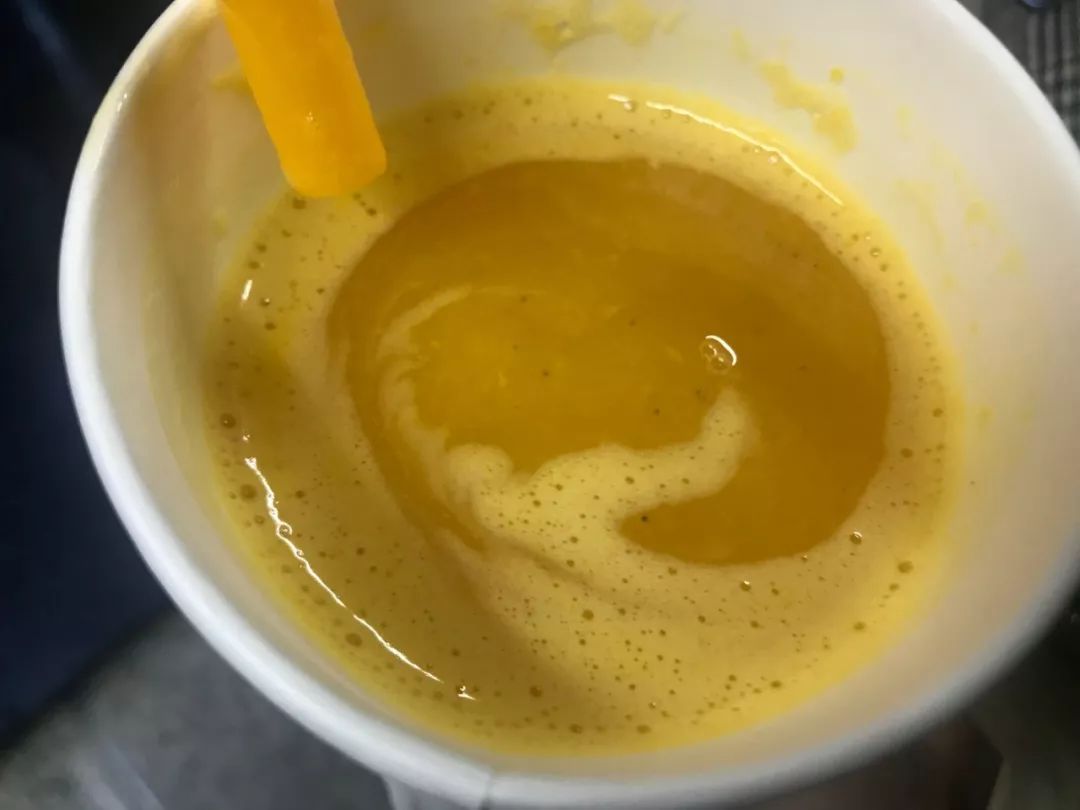 记者现场榨了一杯橙汁,45秒后,橙汁榨好了,确实方便。不过取出橙汁时记者发现,机器的取杯口、取吸管处看起来黑乎乎的,感觉很脏。打开杯盖,果汁内混杂着不少黑渣,一搅拌还会浮上来不少。