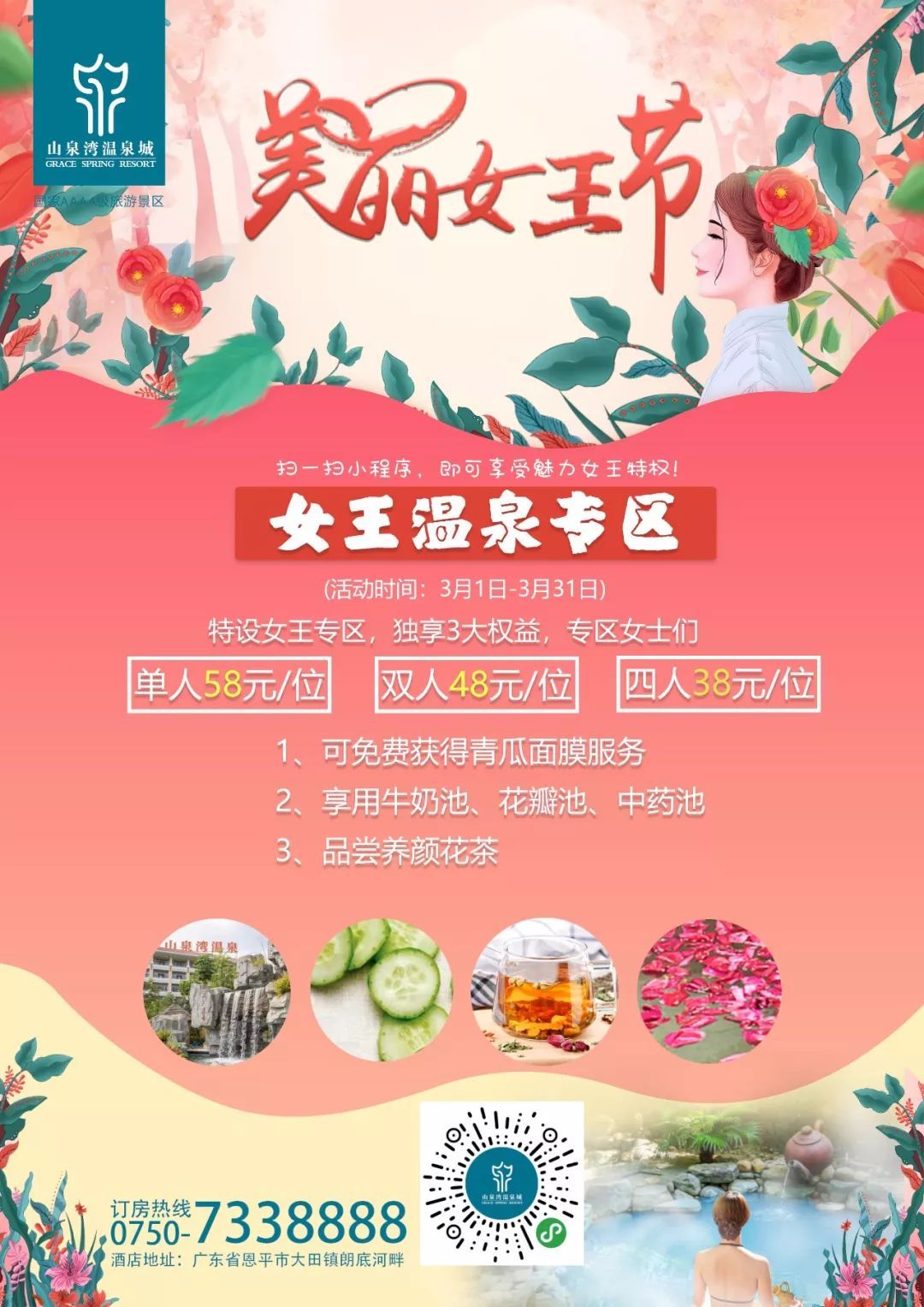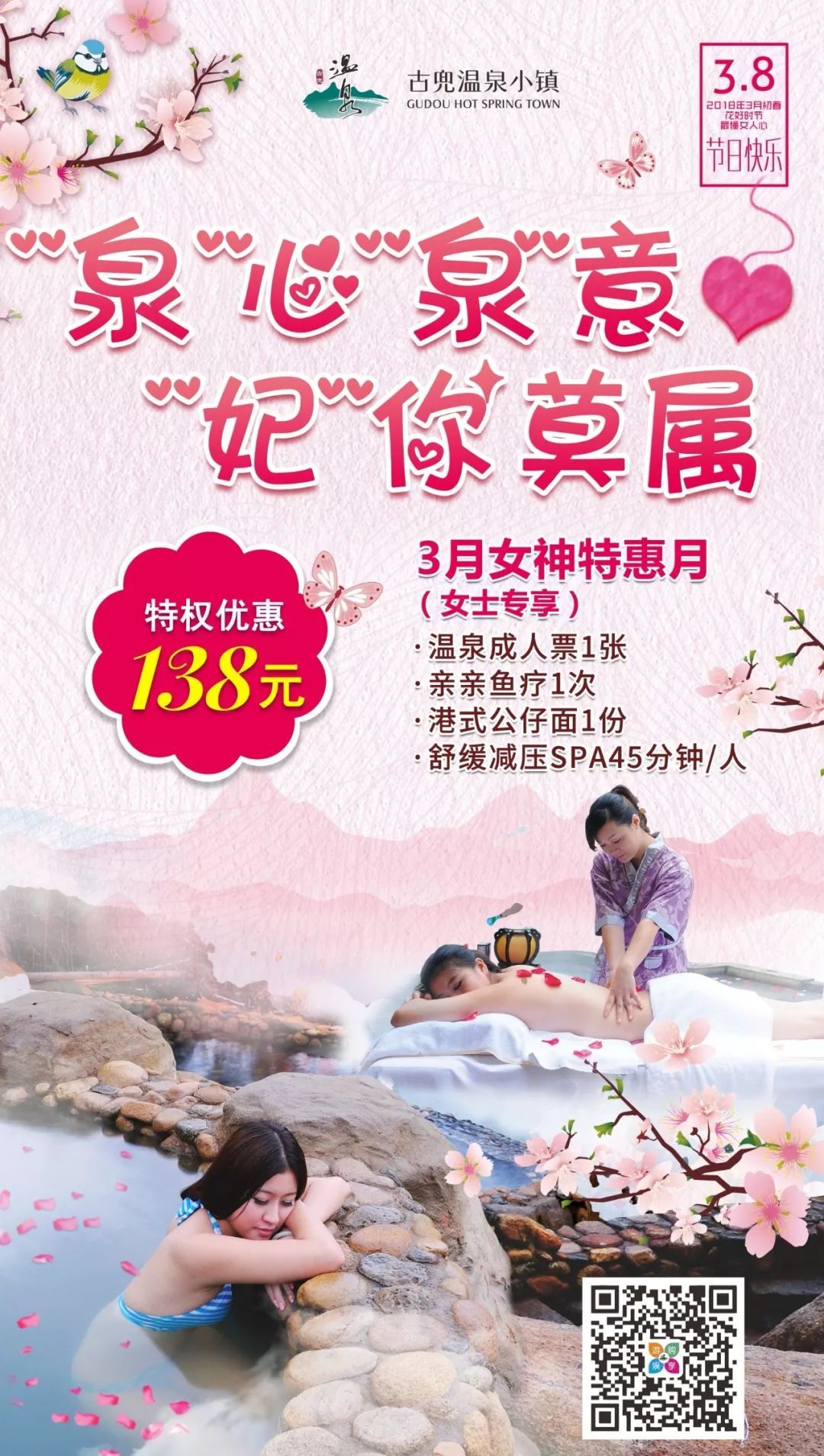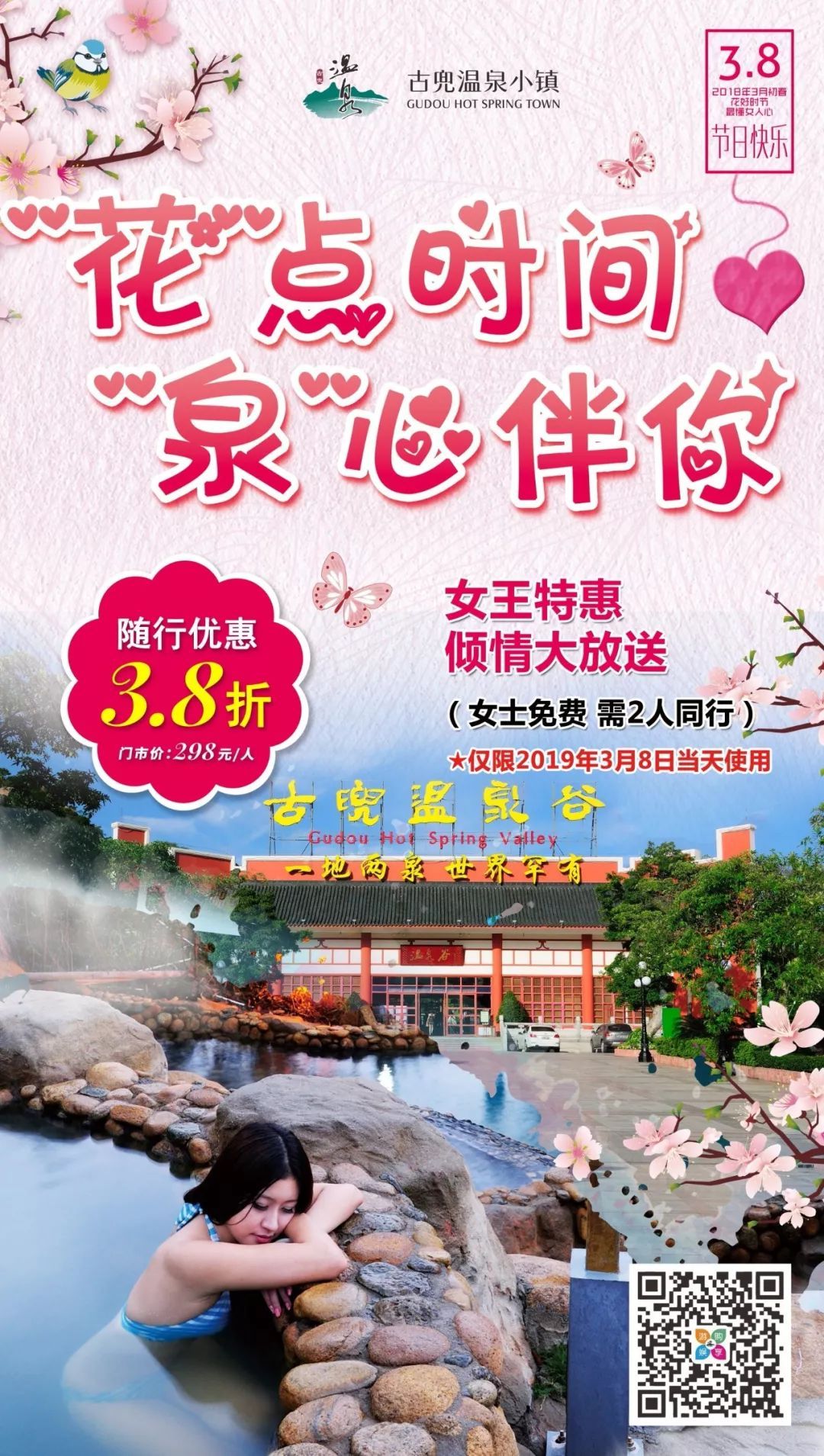 在三八女神节来临之际,古兜温泉小镇推出女神季优惠,温泉门票3.8折起。而且还有女神节特供——泡花泉!这将会带给你不一般的感觉。赏花可以心情愉悦,而泡花泉,可以美颜护肤!