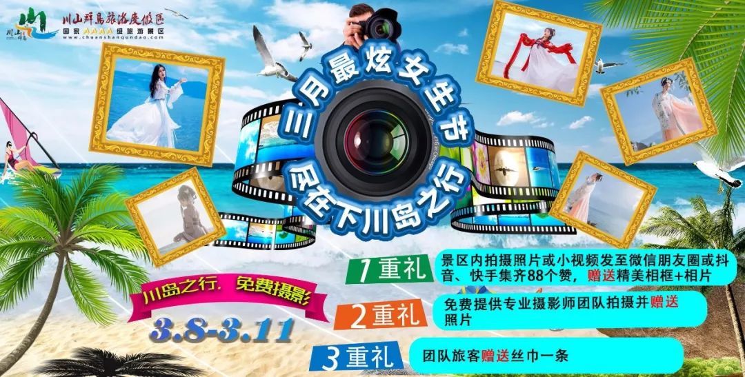 3月8日到11日,台山市川山群岛旅游度假区推出”三月最炫女生节 尽在下川岛之行“主题活动,免费拍摄、赠送丝巾……一波福利正等你来,这个3月,一起感受大海的浪漫吧~