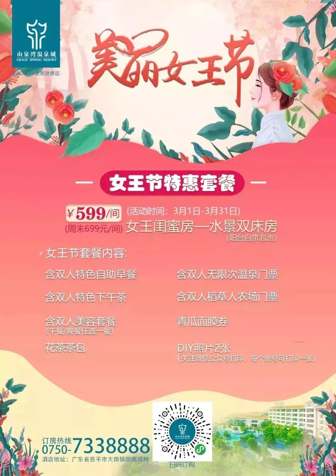 3月1日-3月31日,山泉湾温泉城推出闺蜜双人优惠套餐!活动期间,可用优惠价预订水景双床房哦~除了这个优惠套餐,山泉湾温泉城还有惊喜和优惠等着大家,温泉门票享受58元/位的优惠,两人同行,仅需96元,四人同行,享受每位38元的优惠。