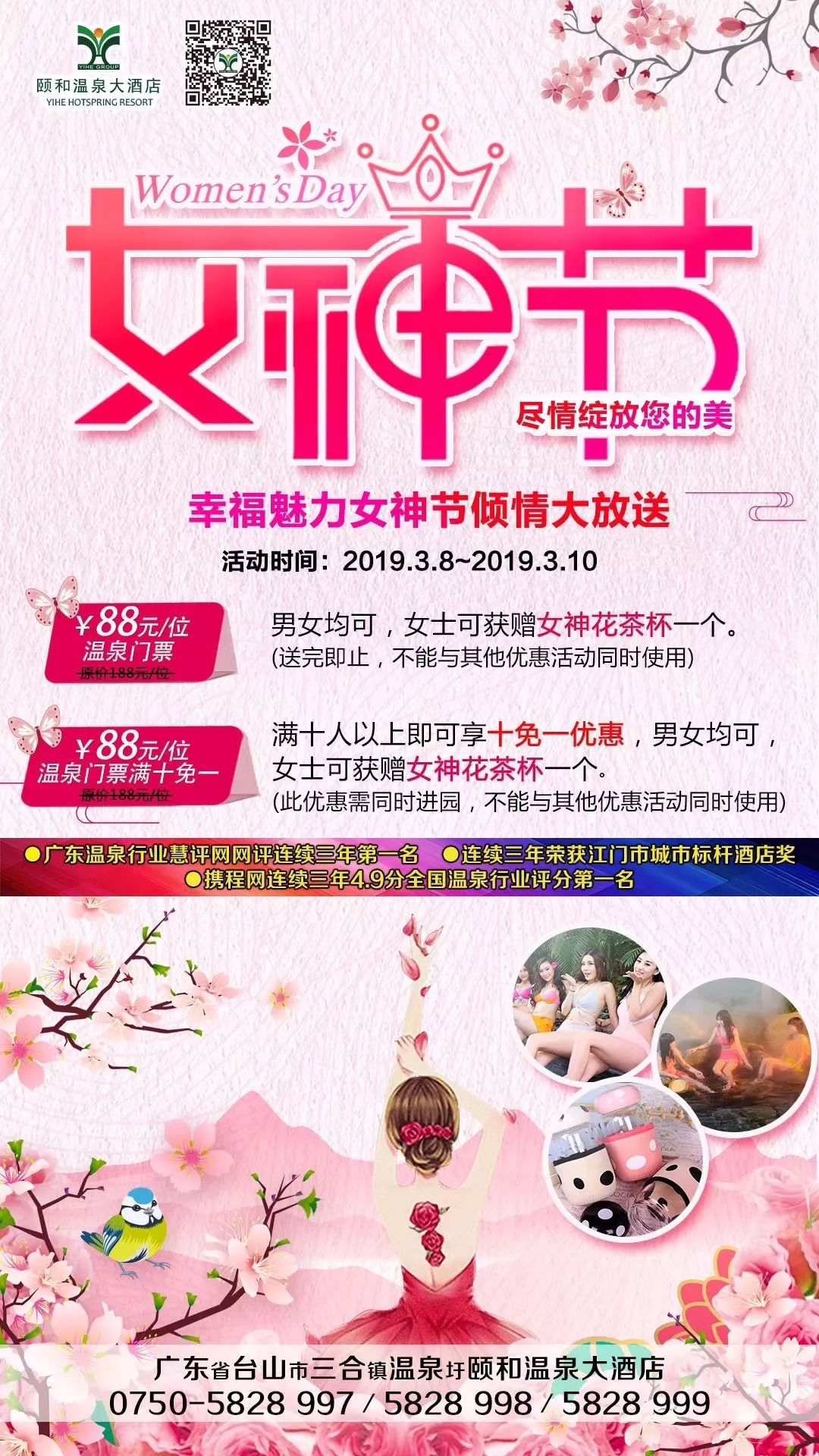 3月8日到3月10日期间,颐和温泉温泉酒店推出三大优惠活动,1.温泉门票优惠折扣,门票仅4.7折,88元/位(原价188元/位),男女士均可享受。2.温泉门票满十免一。在享受门票优惠折扣的基础上,满十人以上即可享十免一优惠,男女均可。(此优惠需同时进园,且不能与其他优惠同时使用)3.女士专享获赠,购买温泉门票,女士可获赠女神花茶杯一个。(送完即止,机不可失)这个女神节,一起来泡汤吧!