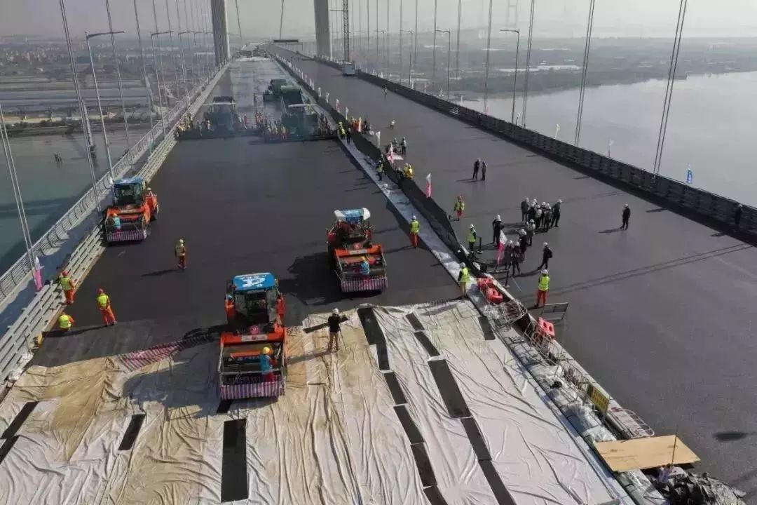 其中,钢桥面采用双层热拌环氧沥青铺装体系,包括“五大结构层、六道工序”,单层铺装面积达13万m²,相当于18个标准足球场,是世界上单体热拌环氧沥青铺装面积最大的工程。