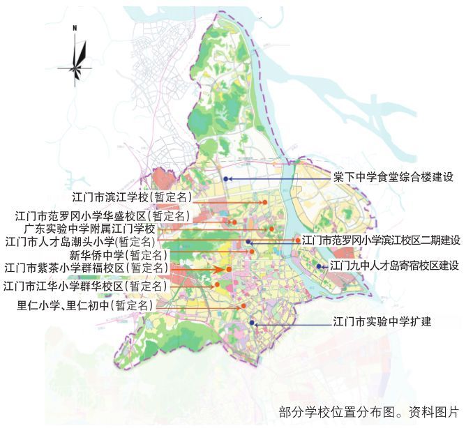 江门市人才岛潮头小学(暂定名):学校选址在江门市潮连岛PJ06—A地段,占地面积约63亩,拟建设一所办学规模为48个班2160人的公办完全小学。