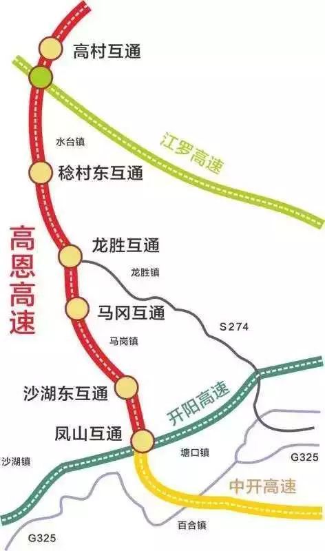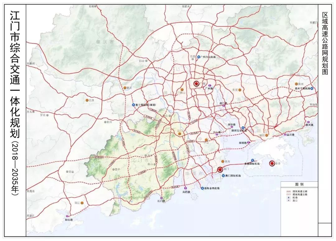 根据《江门市综合交通一体化规划(2018—2035年)》,江门市将打造高速公路“五横五纵二联”格局,其中五横为广中江高速及新干线机场高速连接线、深岑高速、中开—开春高速、斗恩高速及西延线、西部沿海高速;五纵为沈海高速、高恩高速—广台高速、南海至新会高速—新台高速、银洲湖高速、佛江高速—江珠高速;二联为江肇高速、黄茅海通道。