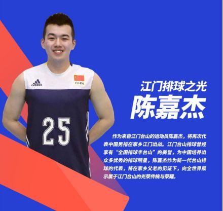 在2019年2月公布的最新一批的国家男排集训名单中,江门台山籍球员陈嘉杰再一次光荣入选中国男子排球国家队,这就意味着陈嘉杰将再次身披国家队战袍,在5月31日至6月2日举行的地尔·2019年世界排球联赛(广东·江门)的比赛中代表中国,与德国男排、伊朗男排、意大利男排展开激烈的对决,并随中国男排一起全力备战2020东京奥运会。而这也将是他第二次回到江门主场,在家乡父老的见证下,代表中国,为国争光。