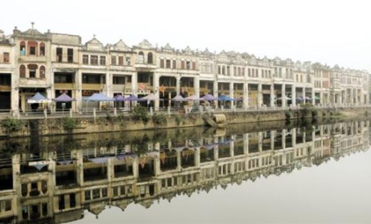 位于江门开平市境内的赤坎古镇,是国家首批特色小镇。由华侨出资兴建的富有欧陆和南洋风情的骑楼建筑群临潭江而立,是除碉楼外,游客到开平必看的另一景点。如今,这里已被棚架和绿纱围住,里面正在进行的是一项投资60多亿元的赤坎古镇华侨文化展示旅游项目。