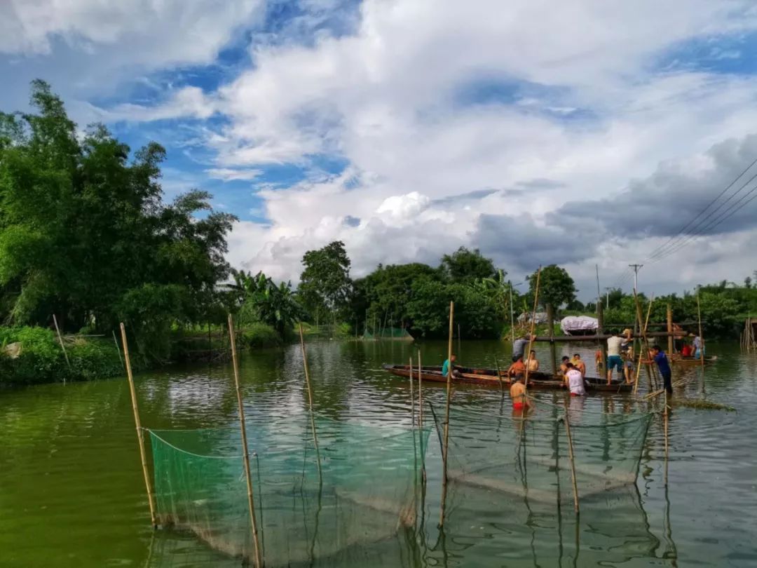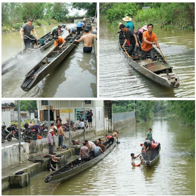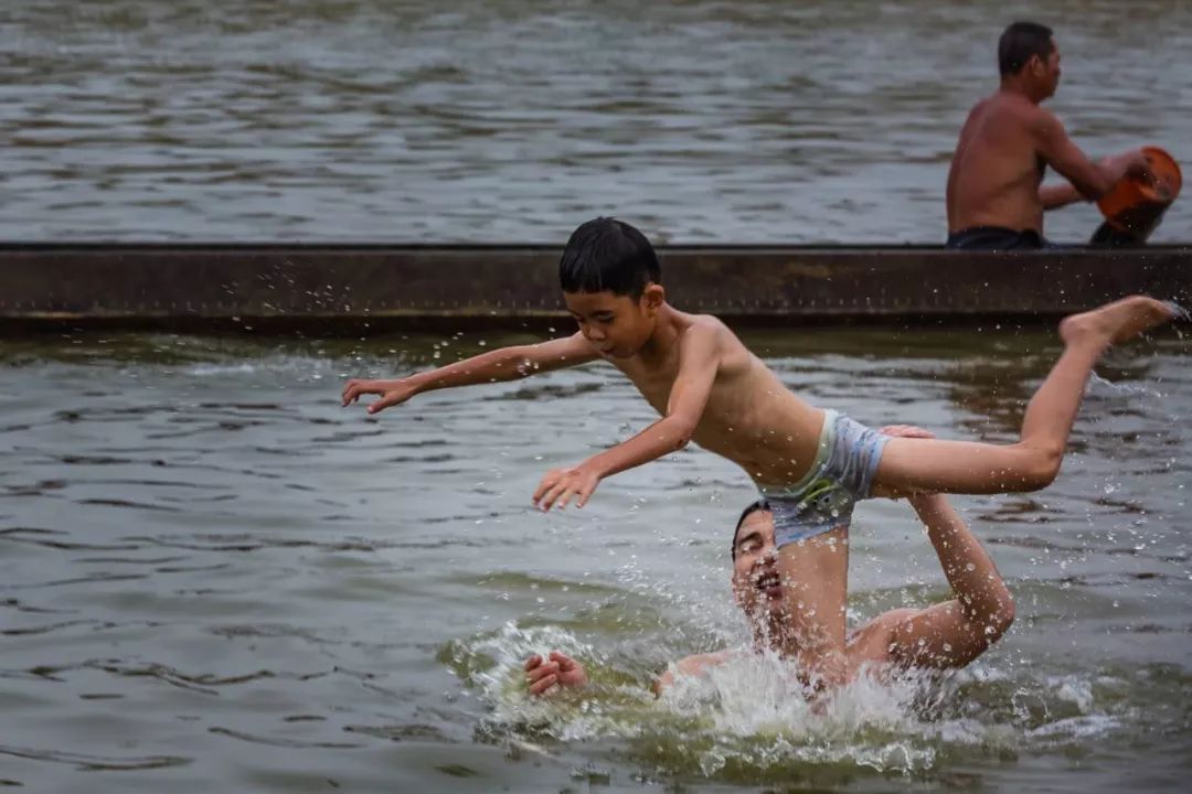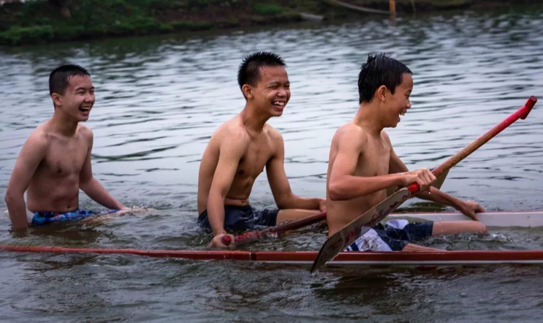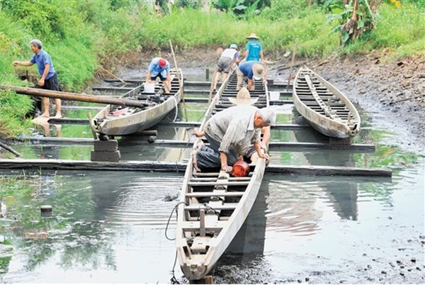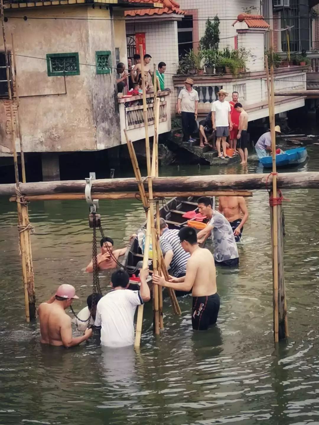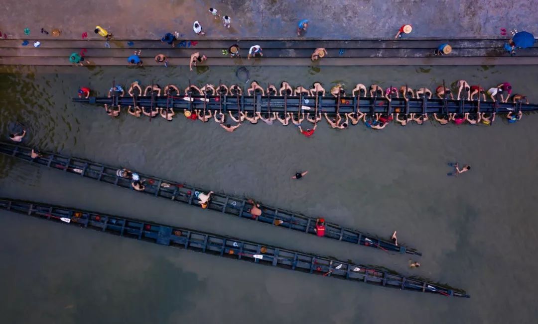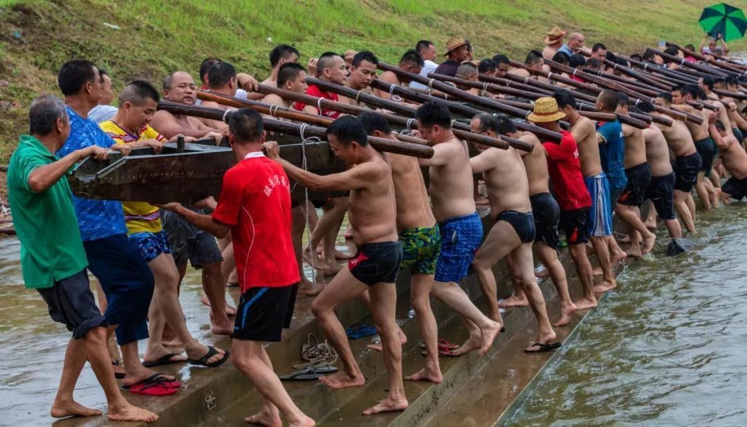 龙船是坤甸木打造的,为防爆裂需长期藏在水下,每年夏初才把它从水下挖起。这是传统的起龙船方式,利用杠杆搅拌的原理,慢慢把龙舟升到水面上。待其浮上水面,扒丁们用各种器皿将船内的水舀干,让龙舟平稳地浮在水面上。