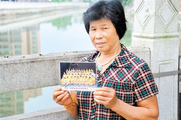 梁婵好向记者介绍2009年成立时的东甲一村凤艇队队员。张奕维摄