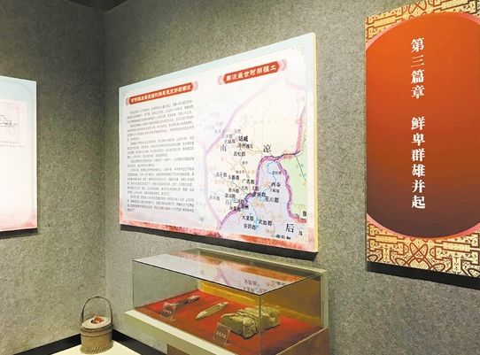 “走进鲜卑”展厅在文化馆居中位置,约300平方米,面积最大。以图文和实物方式介绍古代鲜卑族的起源、发展、兴盛和衰落过程,集中叙说拓跋、秃发、慕容、宇文、段氏、柔然等鲜卑部落的传奇故事,展示鲜卑独特的历史文化以及它们与中原文化的融合与影响。