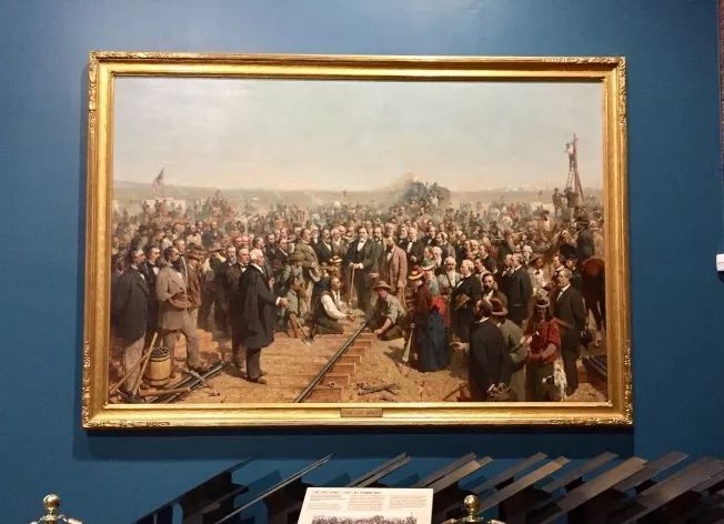 时任美国太平洋铁路公司总裁、前加州州长的斯坦福高举银质大锤,将一颗纯金的道钉砸进了铁轨中——随着这一声锤响,太平洋铁路正式合龙的消息传遍整个美国,引发无数的欢呼声。