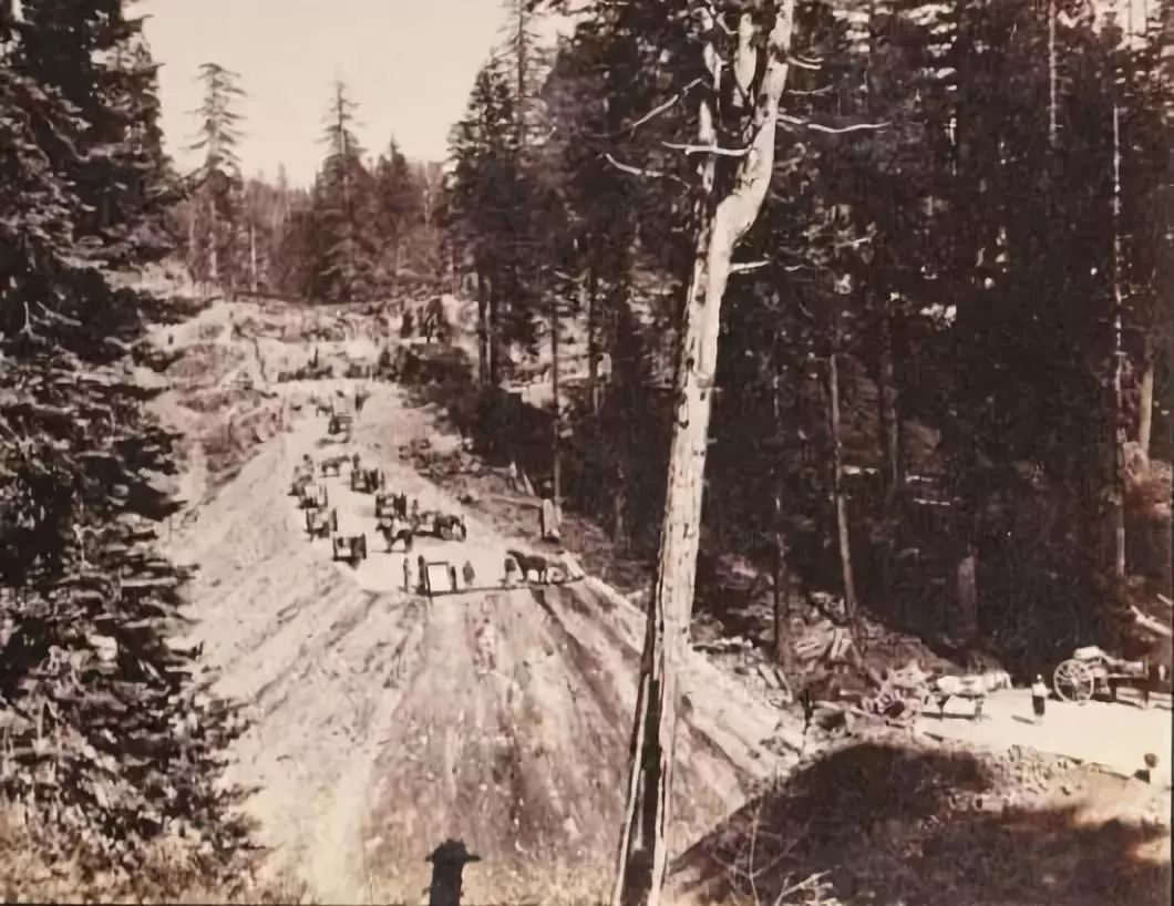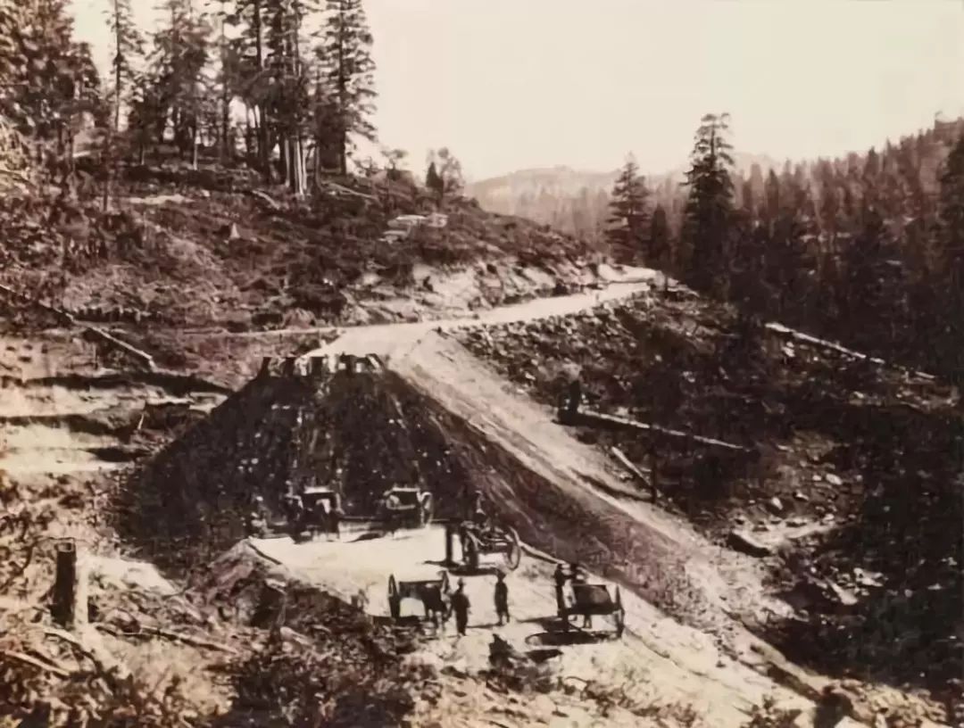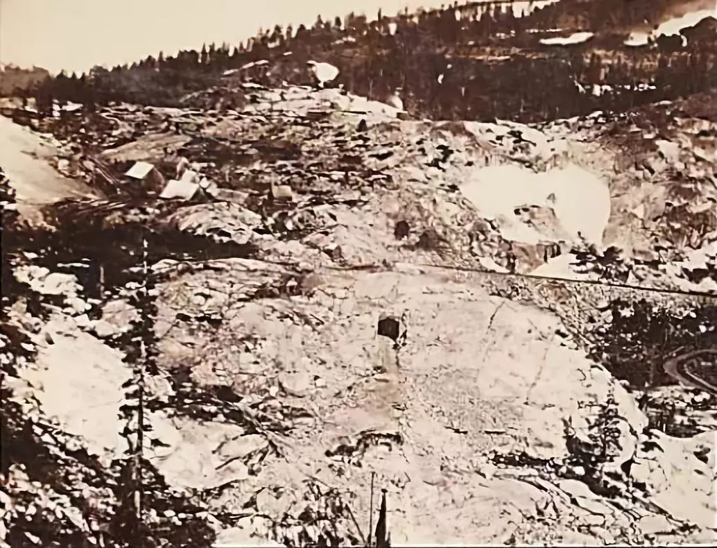 1866年秋天,西拉内华达山唐纳关施工情景。(摄影师:Alfred A.Hart 资料来源:斯坦福大学图书馆)