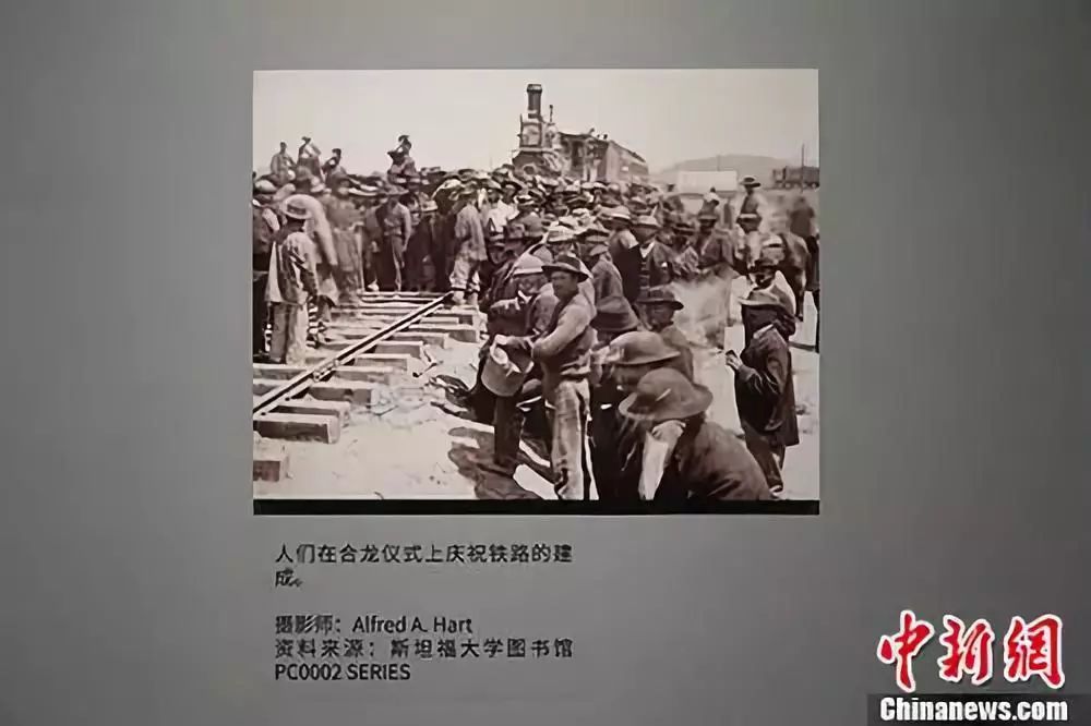 2017年,中国华侨历史博物馆“跨越时空的回响——纪念150年前铁路建设中的华工”展览。图为来自斯坦福大学的珍贵图片资料。 中新社记者 周欣嫒 摄