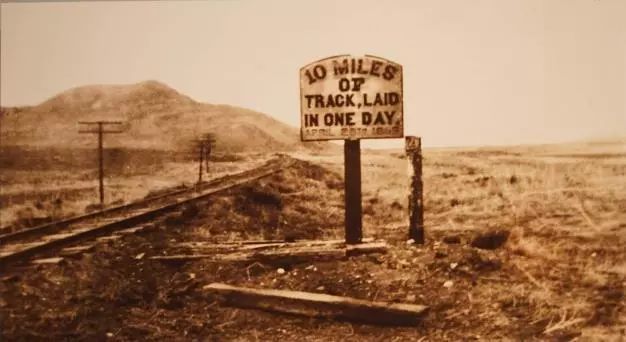 日铺设10英里铁轨记录终点标志。(摄影师:Alfred A .Hart 资料来源:斯坦福大学图书馆)