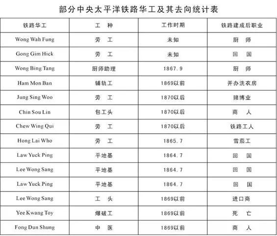部分中央太平洋铁路华工去向 (图片来源:广东华侨博物馆)