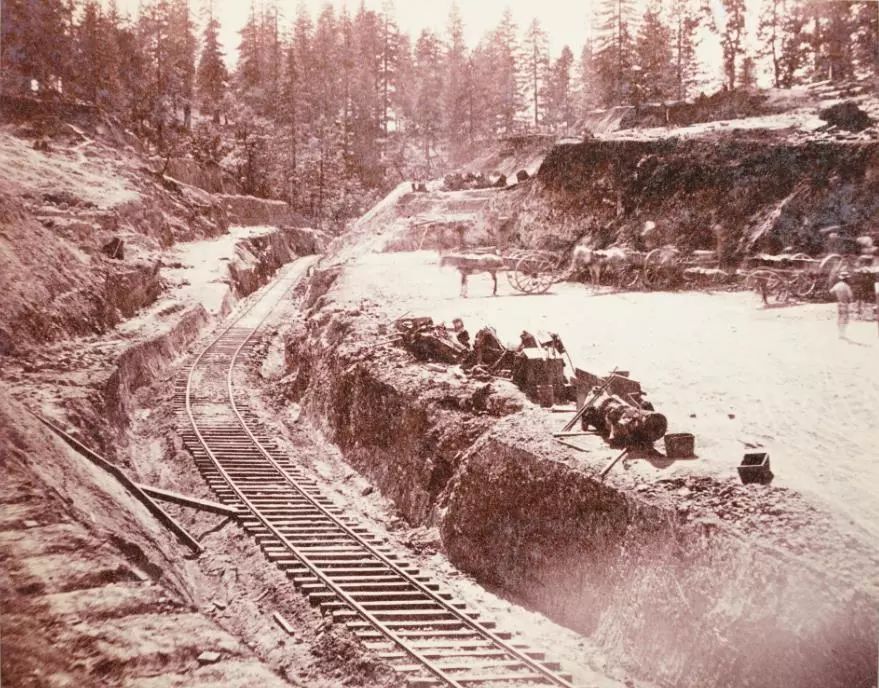 1866年夏,华工在Sailor's Spur用开挖路基槽的土方垫起沟壑处的路基。 (摄影师:Alfred A.Hart 资料来源:斯坦福大学图书馆)