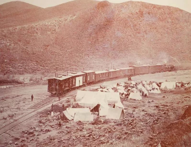 铁路施工进程中,华工们住在建筑工地旁的帐篷里,而老板和工程师们住在火车上。(摄影师:Alfred A .Hart 资料来源:斯坦福大学图书馆)