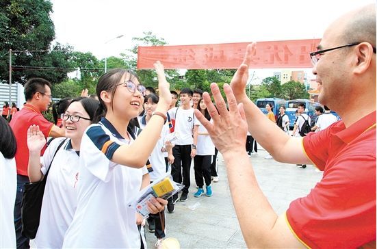 △高考首日,我市所有考点平稳顺利,考风考纪良好。图为恩平一中的老师们穿上了红色衣服,和考生们击掌鼓劲。张安怡 摄