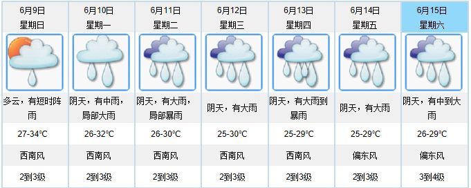 今天,多云,局部有阵雨,气温27到35度。天气炎热,注意防暑降温;另外,晴雨转换快,需注意防御局地雷雨。预计9日多云,天气炎热,有短时阵雨;10-14日有大到暴雨降水过程,并伴有雷暴。目前正值“龙舟水”时节,降水频发,请留意最新天气预报预警信息,防御强降水及其引发的次生灾害。