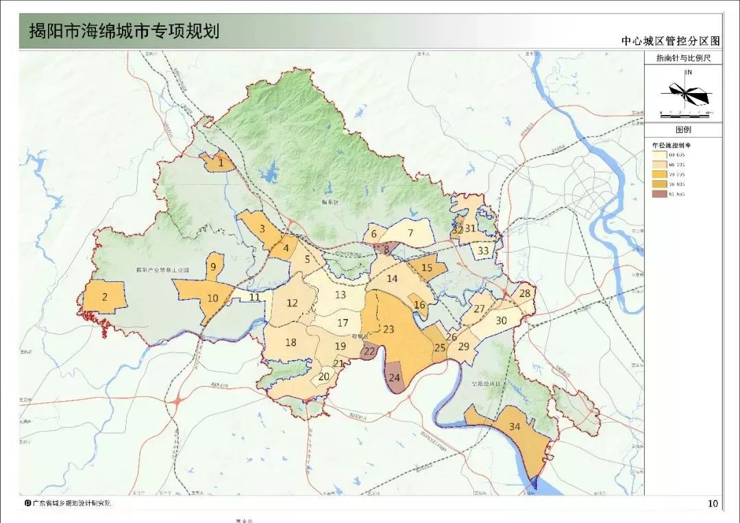 海绵城市的分区采取顺应城市水系特征,便于城市管理,科学合理划分的原则。具体以水系、河道、流域边界范围,结合防洪排涝规划中排水分区,同时以揭阳市排水管网的走向为基础,结合城市的行政分区将揭阳市中心城区划分为34个海绵城市管控分区,以方便专项规划与下层次的控制性详细规划的衔接,更好的指导城市的下层次规划,将海绵城市的专项规划成果充分的落实到城市建设中。