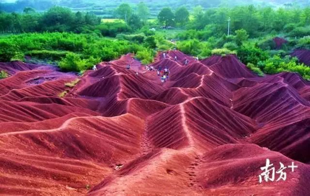 红沙漠是始兴县独特的风景线,这里山坡沟壑纵横,把整个山坡分裂成一列列的土堆,远看如连绵的山脉,行走于此,感觉自己身在新疆的戈壁。