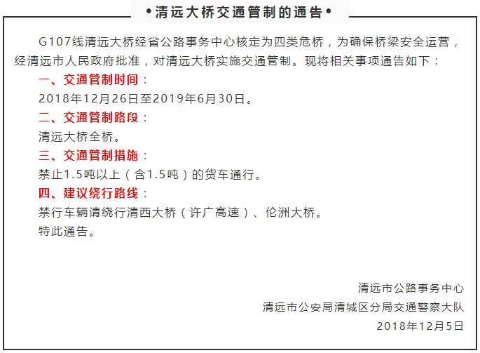 12月26日至明年6月30日,清远大桥将实施交通管制,期间禁止1.5吨以上(含1.5吨)的货车通行,禁行车辆请绕行清西大桥(许广高速)、伦洲大桥。