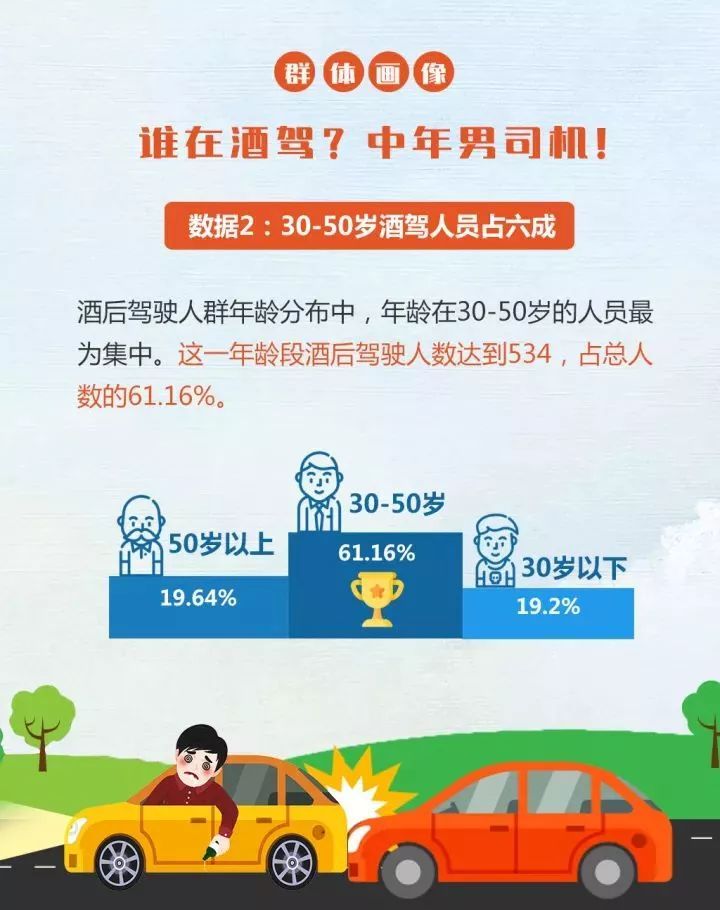 1.20岁到30岁的男性步入社会不久,经济收入尚有提升空间,有车族的比例本身就小。因此,此年龄段男性虽然爱喝酒并且处于情绪、体力的高峰期,但酒后开车的机会比较小。