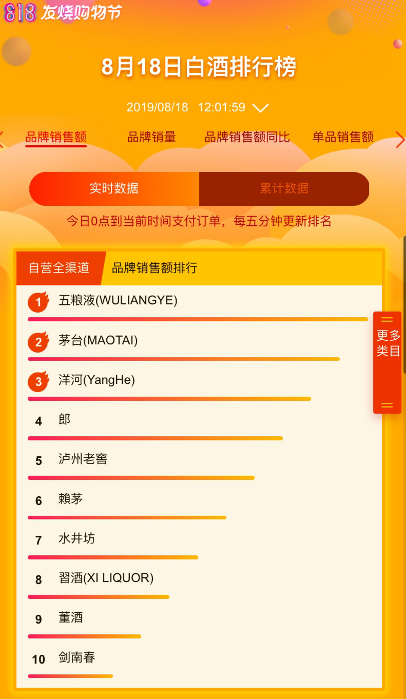 悟空榜数据显示,截至18日中午12点,红星、洋河、泸州老窖成为销量最高的白酒品牌,销售额方面,五粮液夺冠,茅台、洋河步步紧逼。长城、奔富、张裕在红酒中最受消费者欢迎,雪花、哈尔滨和青岛夺得啤酒三魁。