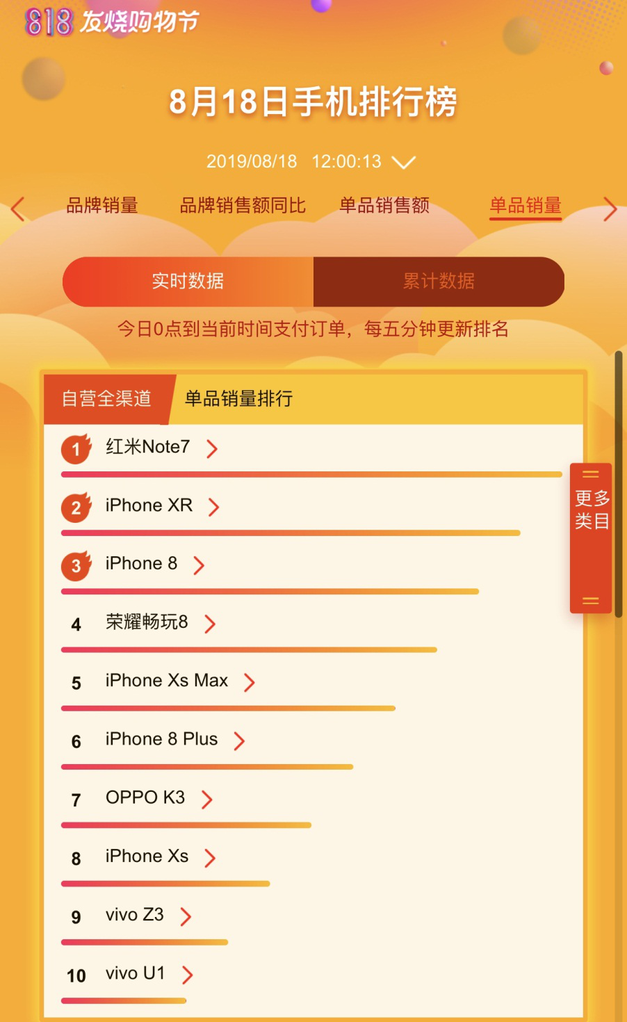 苏宁818期间,苹果、华为等多款手机降价,“以旧换新”加持,消费者的购买热情被激发。截至8月18日12点,红米Note7夺单品销量第一,iPhone XR、iPhone 8紧追其后。小米、荣耀系列产品表现抢眼,品牌销量额进入前三。
