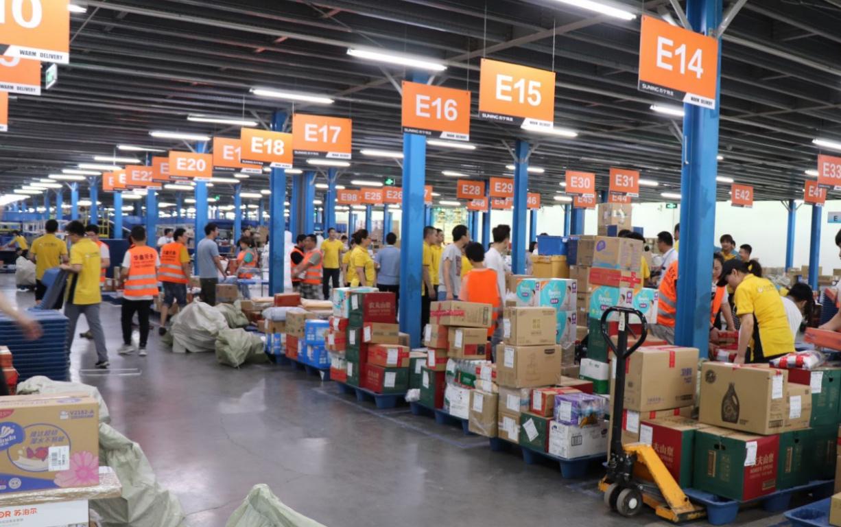 苏宁物流基地内,已经火力全开,火箭哥将把消费者下单的商品准时送达。