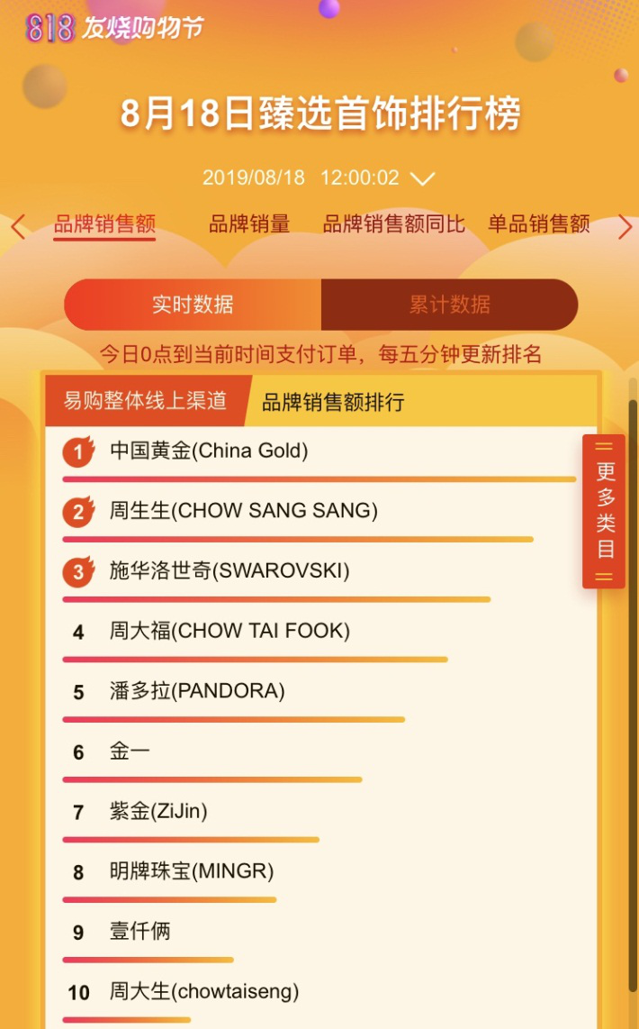 黄金珠宝成为苏宁线上发力的又一优势,中国黄金、周生生、施华洛世奇成为818甄选首饰品牌销售额排行榜前三。