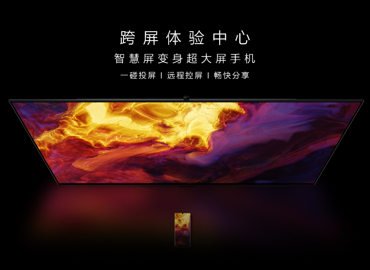 华为智慧屏为65英寸,在此前的华为Mate20 X 5G版发布会上就已经宣布其宣传语为 “让智慧变大”。一方面,这符合华为消费者业务CEO余承东所说的“它实际上是一个大屏的手机”;另一方面,巧合的是,其相比荣耀智慧屏的55英寸屏幕更大,是更大一号的智慧屏。此次官方放出的三款宣传海报突出了“无线视界”、“时空互联”和“声波奇遇”三个概念,暗示了全面屏、智能联动和音效三个卖点。同时,它也具备荣耀智慧屏同款的弹出式摄像头。