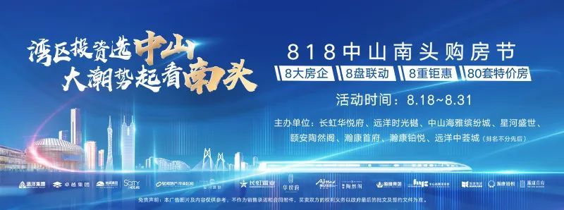 8月18日,中山房地产业界推出重磅活动,此次活动,由远洋、长虹、卓越、旭辉、星河、颐安、海雅、瀚康8个开发商(排名不分先后)联手举办。届时,大湾区楼市大咖将齐聚中山共话南头未来。