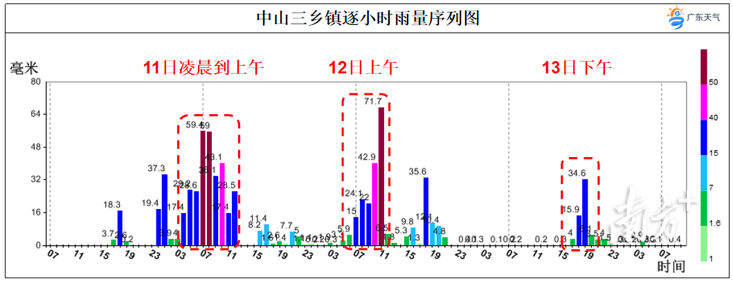 从“广东天气”微信公众号发布的“中山三乡镇逐小时雨量序列图”来看,三乡的雨下得并不均匀,三次雨量高峰分别是11日凌晨到上午、12日上午及13日下午。