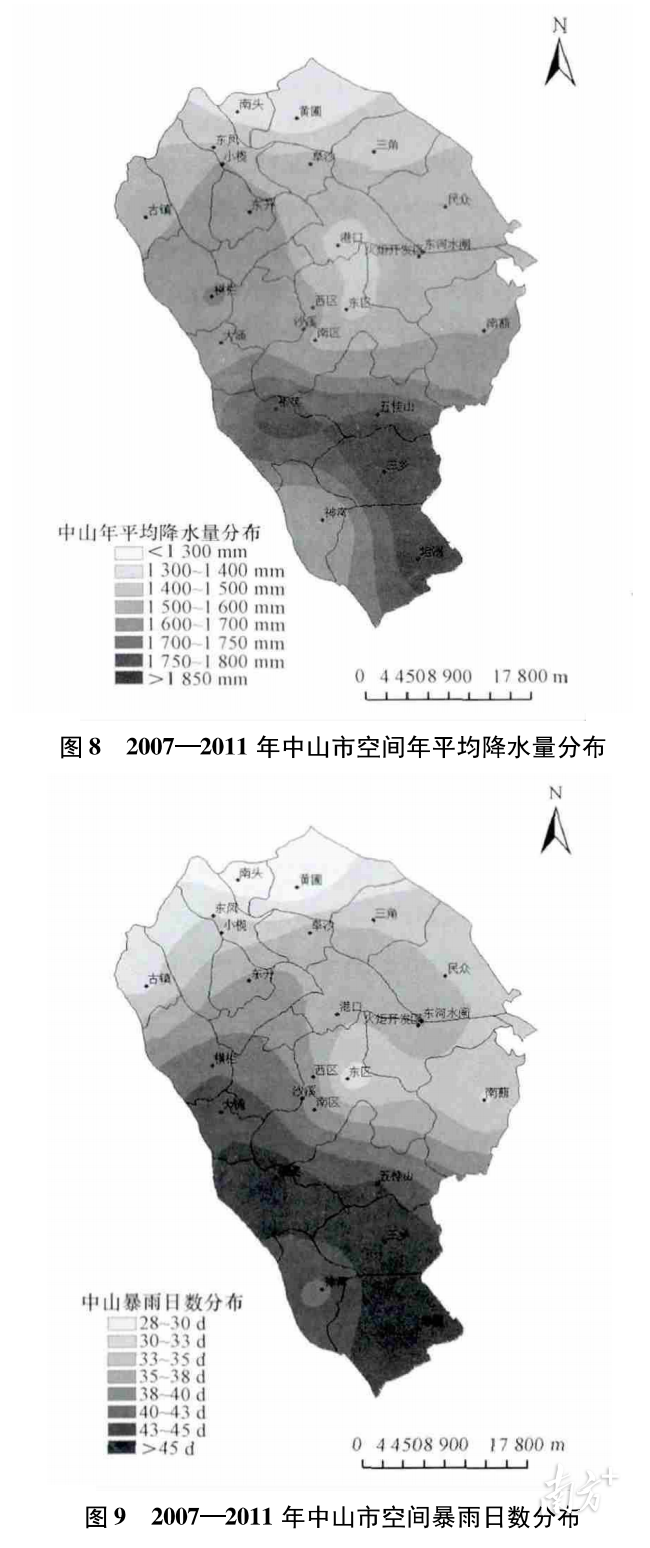 暴雨多的镇街,年平均降水量也就大。从“2007—2011年中山市空间年平均降水量分布”和“2007—2011年中山市空间暴雨日数分布”两张图中可以看出,坦洲、三乡和板芙形成了中山的一条“暴雨带”。