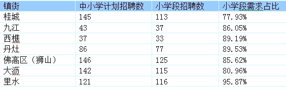 可以看到,在南海总体的公办中小学师资需求中,以小学阶段的需求最为紧迫,里水镇甚至将超过95%的公办教师名额用在了小学教师的招聘上。
