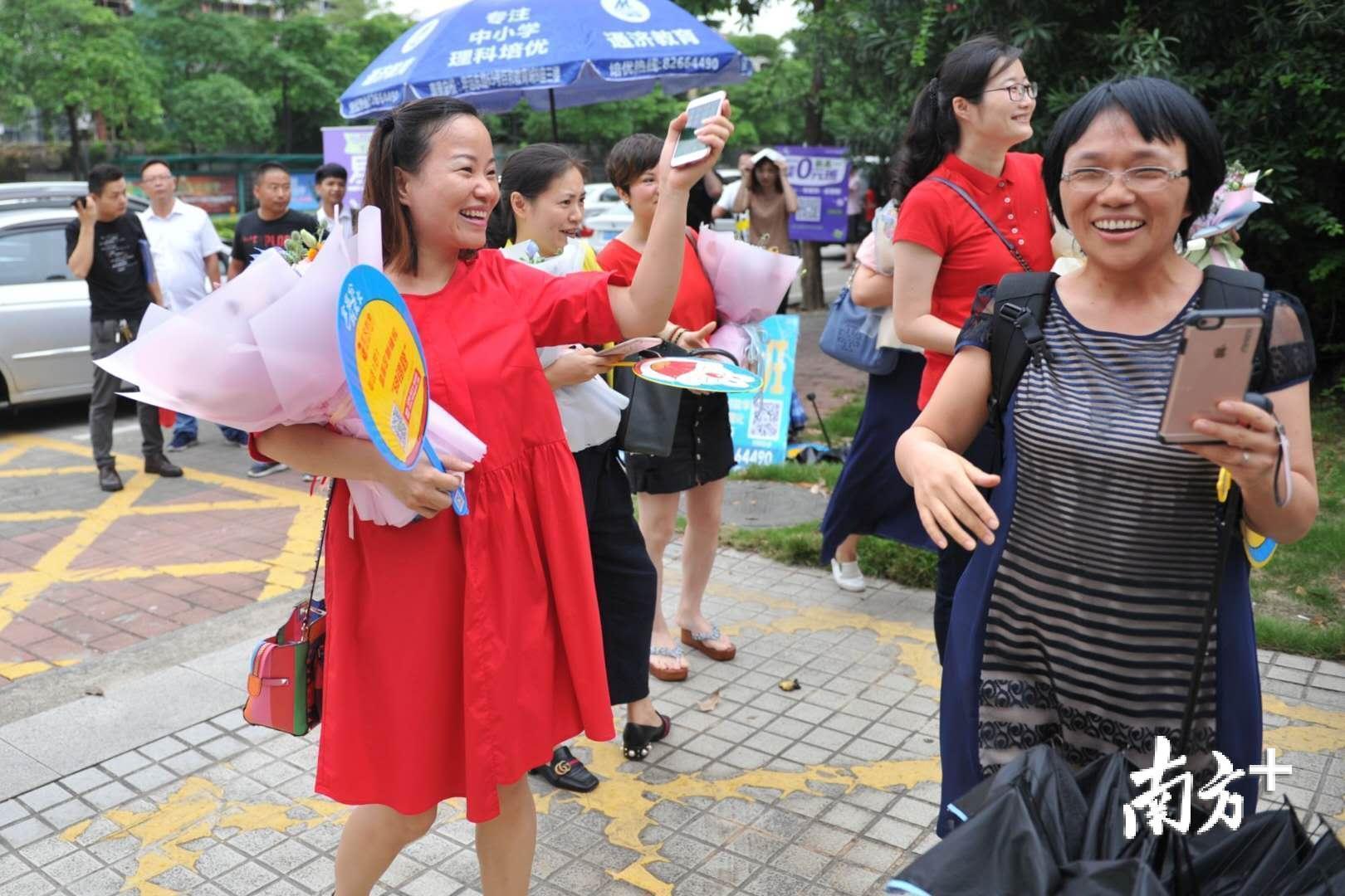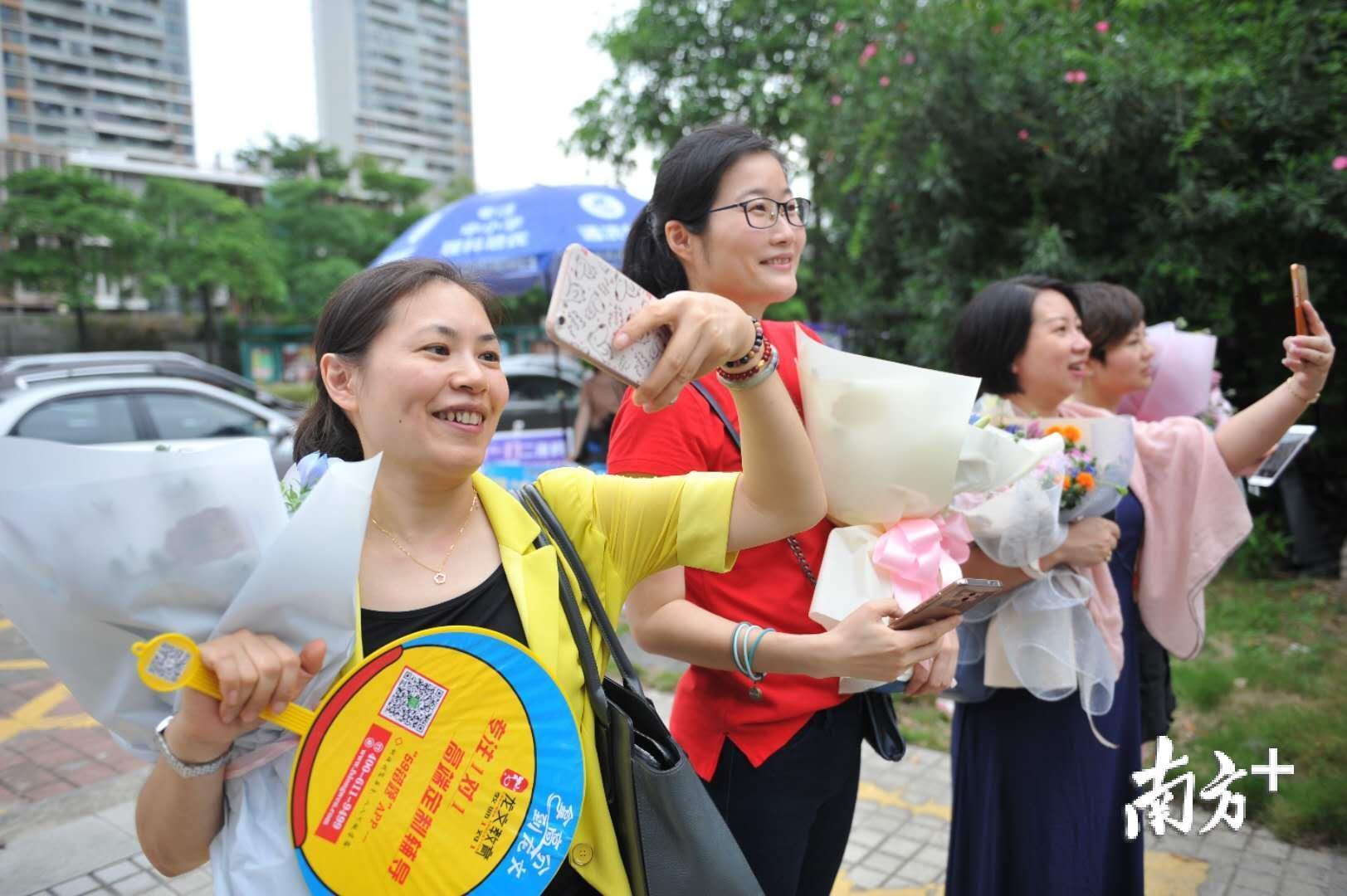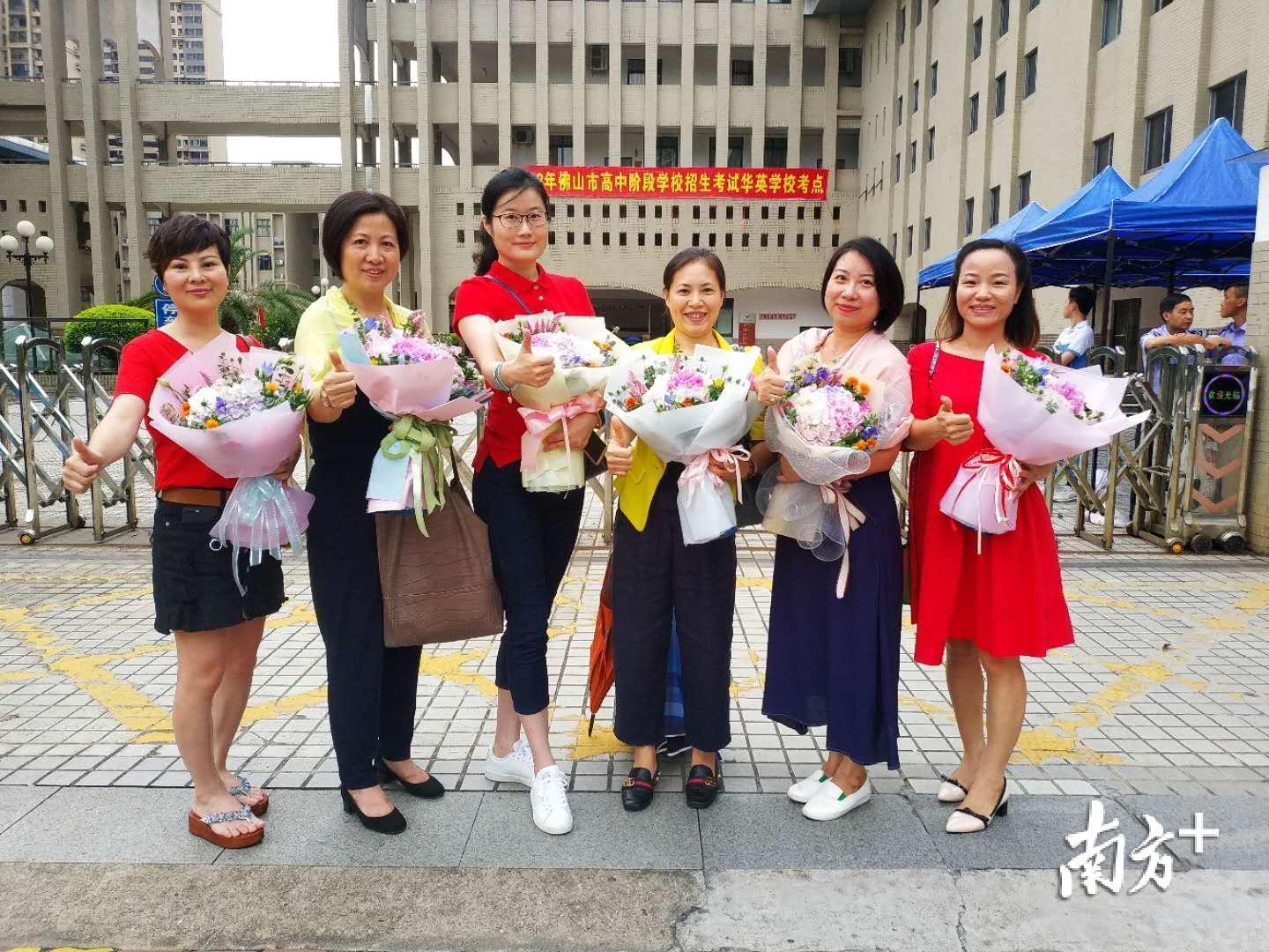 美女妈妈来袭~佛山市实验学校的考生家长约好一起带上鲜花为孩子庆祝,事前并未告知孩子,准备给他们一个惊喜。(戴嘉信 摄)