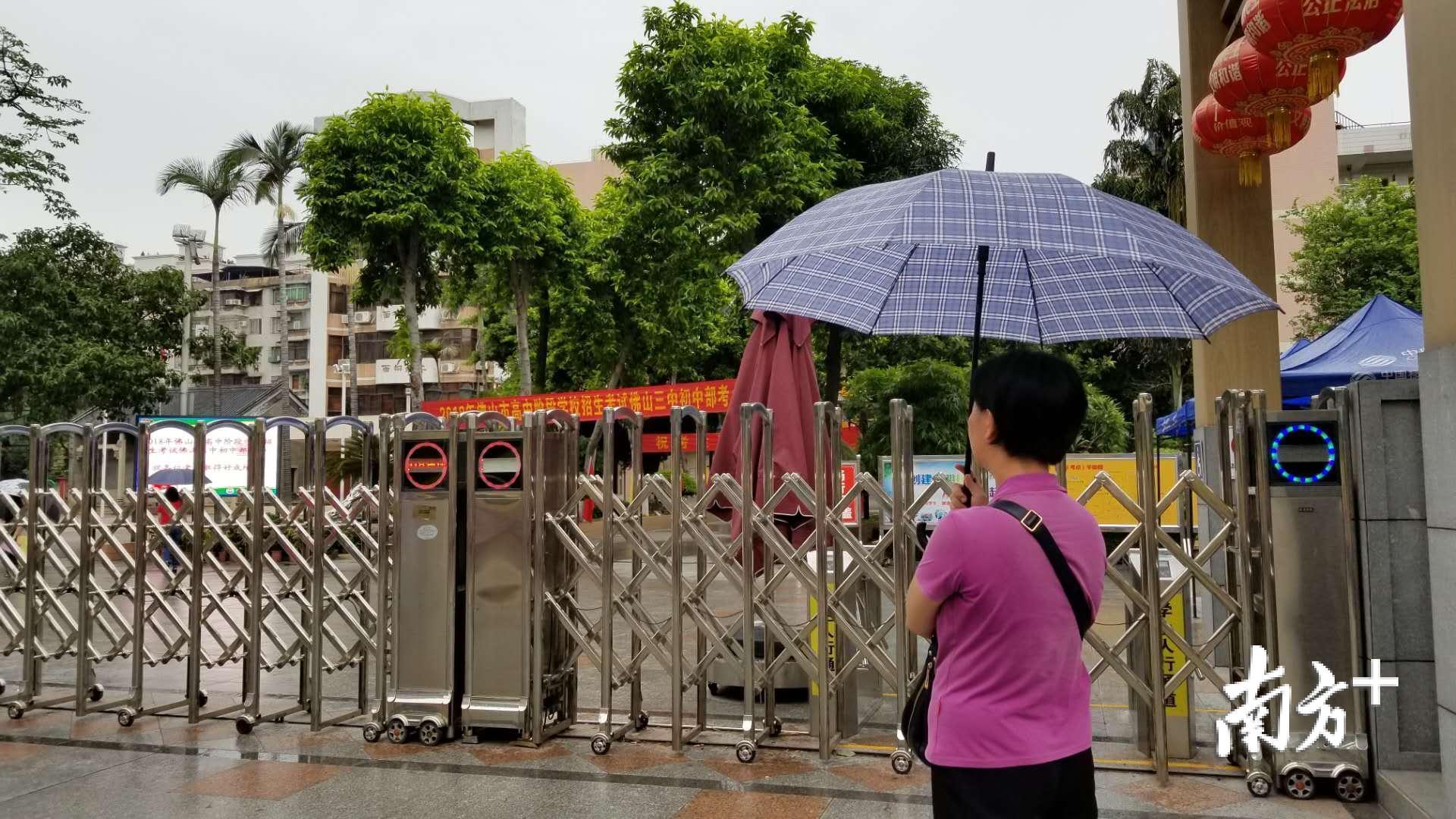 这位穿着紫色衣服的家长提前在佛山三中初中部门口等待迎接孩子,她说,陪考三天的心情,“就像自己去中考一样紧张”。她还说,孩子考完试就和他去旅行,已经定了好一些出行目的地了。(杨馥铫 摄)