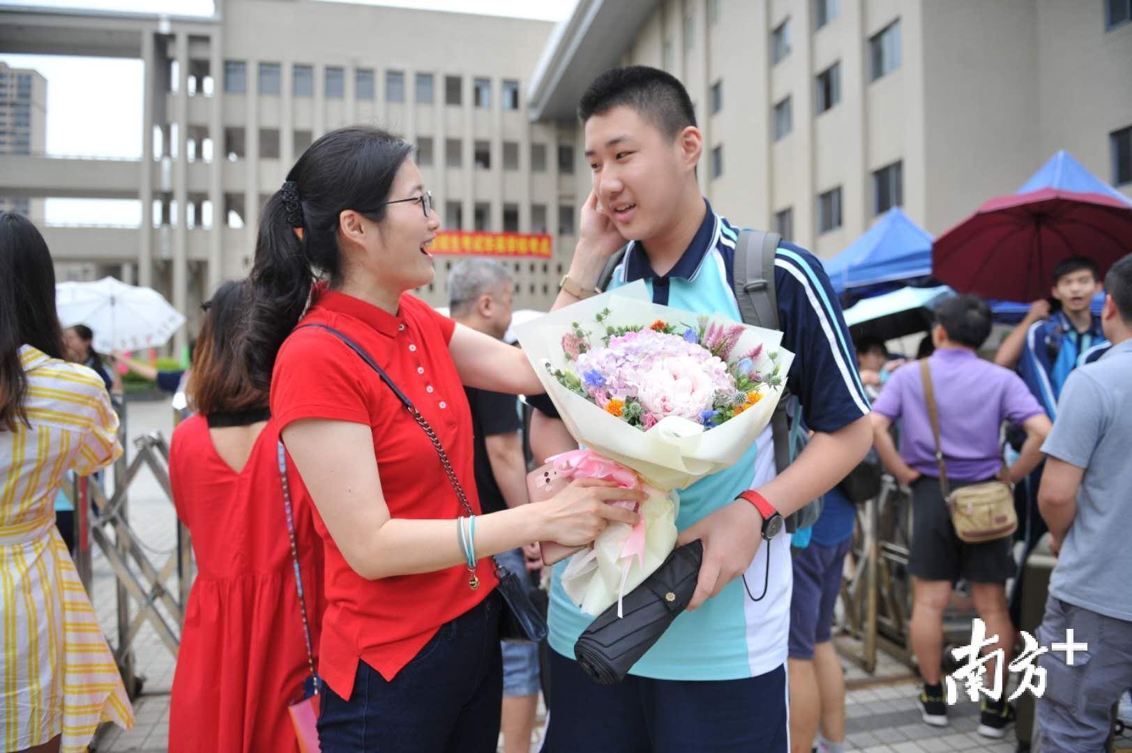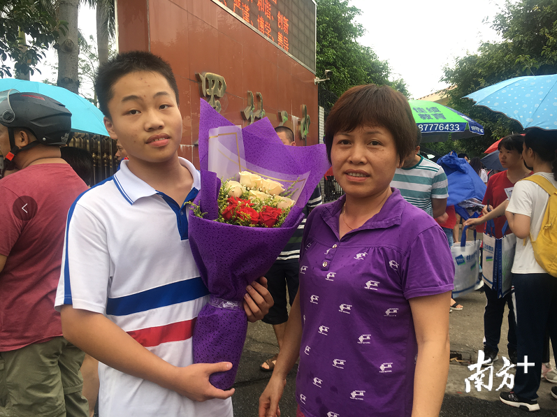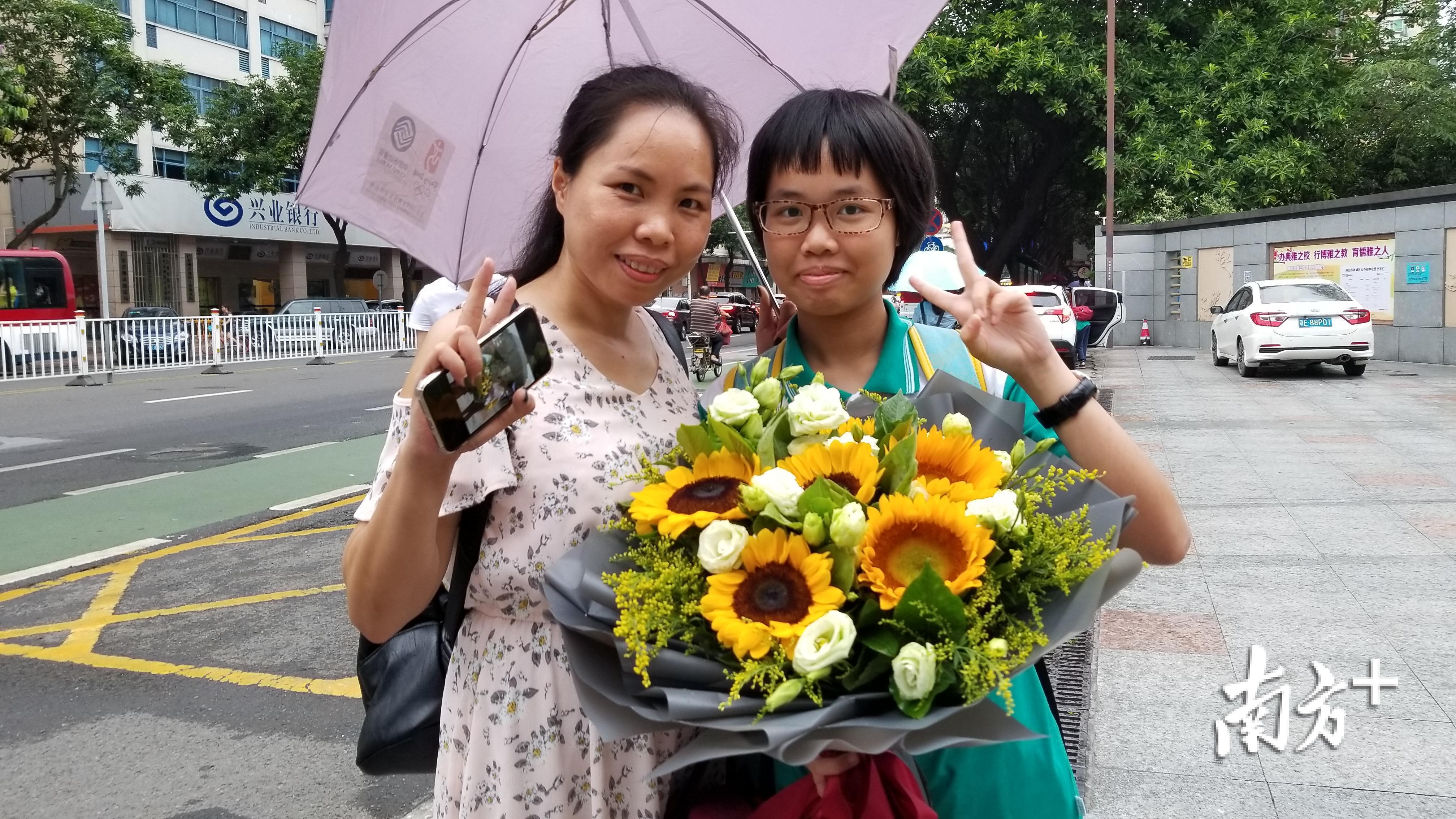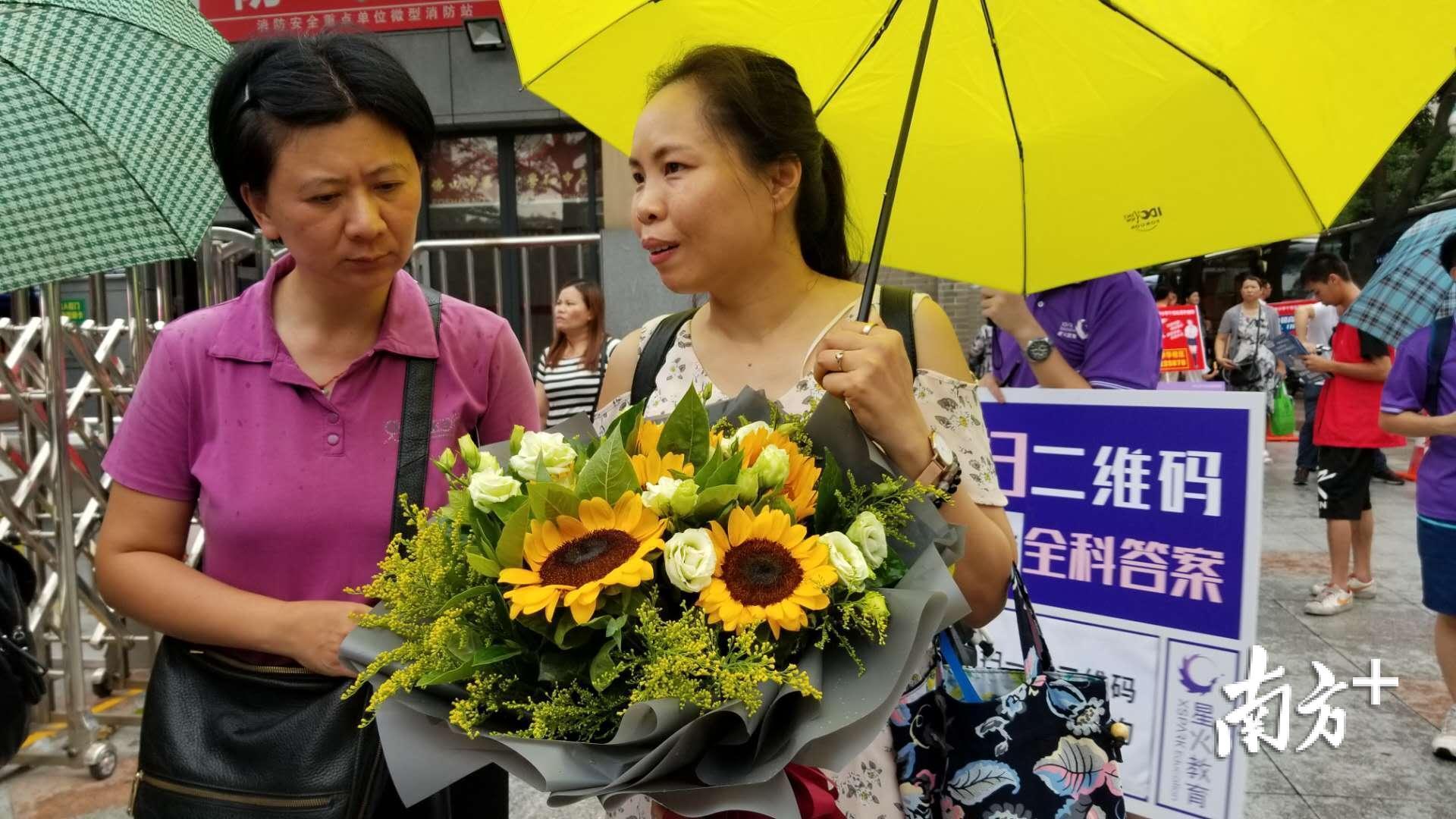 接到啦!佛山三中初中部铃铃同学的妈妈谢小姐给女儿送上了提前准备的花束。铃铃同学说,现在最想补觉,她计划假期先去旅游放松心情,毕业典礼后就开始预习高中的知识。(杨馥铫 摄)