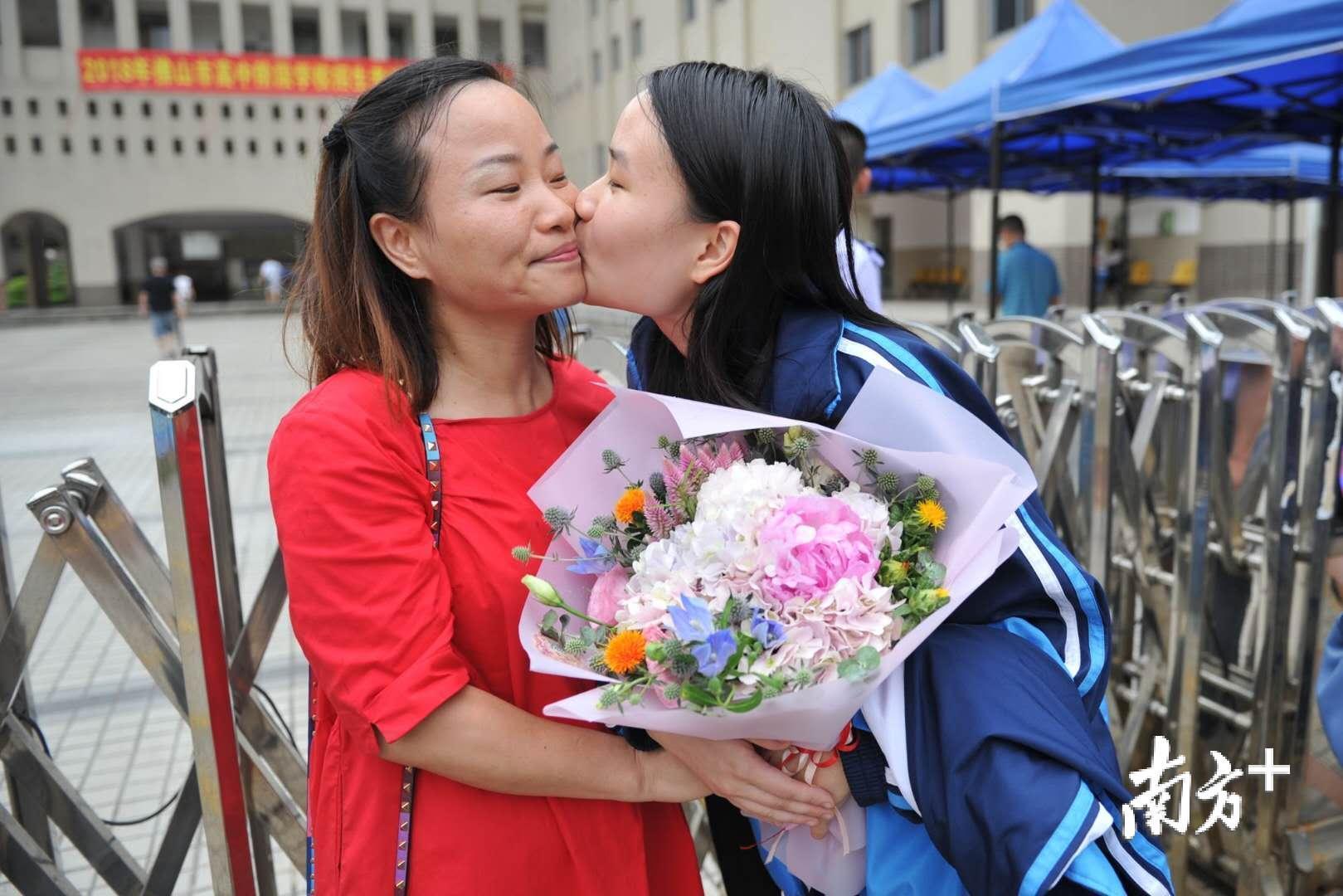 佛山市实验学校的考生黄晨献给妈妈一个深情的吻,谢谢妈妈一直以来的陪伴和支持。(戴嘉信 摄)