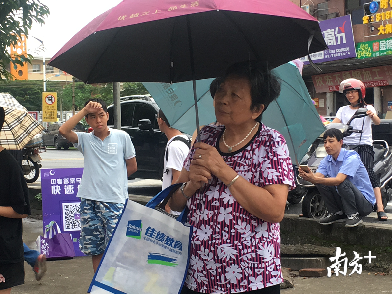 75岁的朱婆婆说孙子考完特意过来接他。“我怕塞车就坐公交早点过来,他不知道我过来的,我要站前一点,看着孙子出来。”(王雅铄 摄)
