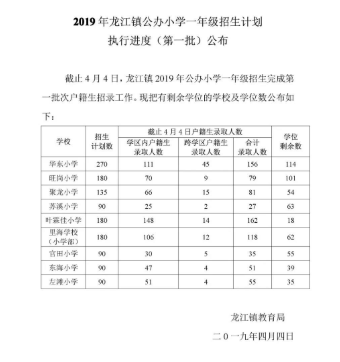 目前,龙江已完成第一批次户籍生招录工作,其中城区中心小学、世埠小学、坦田小学等3所学校已无剩余学位,其他9所学校截至4月4日还剩余学位合计541个。