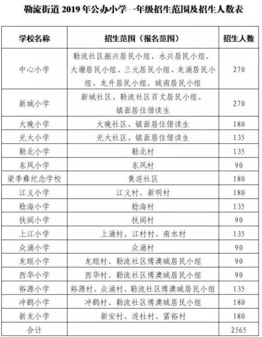 根据《勒流街道2019年公办小学一年级招生方案》,今年勒流公办小学一年级共计划招生2565名,报名时间和录取公榜安排分勒流户籍及政策性借读生、普通借读生两个阶段进行。